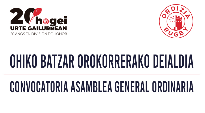 De conformidad con lo dispuesto en el artículo 19 de los Estatutos de la Asociación Deportiva de Rugby de Ordizia, y en uso de las facultades allí conferidas, se convoca a los socios del club a ASAMBLEA GENERAL ORDINARIA. Esta asamblea se celebrará el miércoles 23 de julio de 2025 en el Salón Principal del Palacio Barrena de Ordizia (Gipuzkoa), a las 17:30 h en primera convocatoria y a las 18:00 h en segunda. El orden del día será el siguiente: